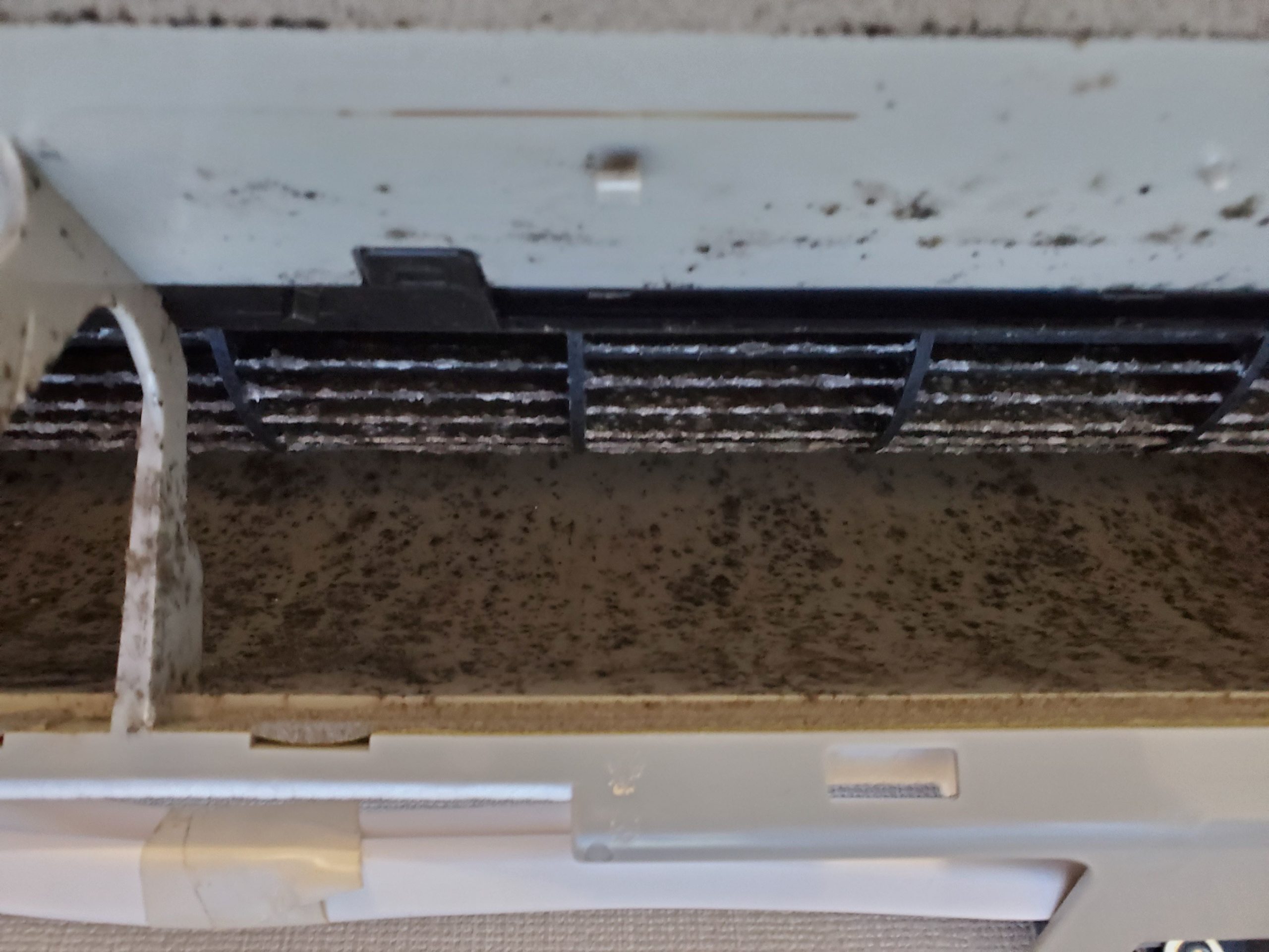 吹き出し口を確認すると、6年分の汚れがびっしりと付着していました。