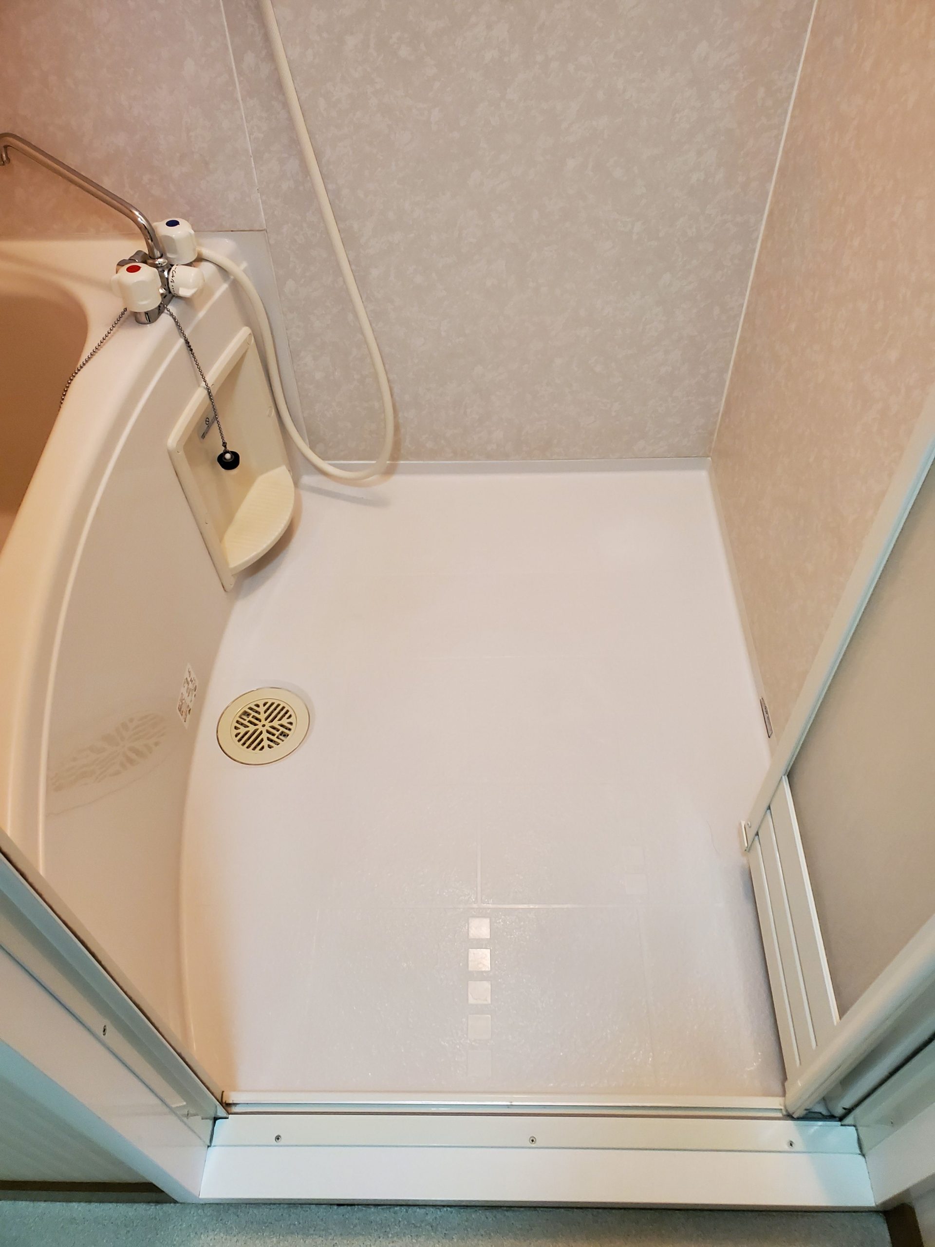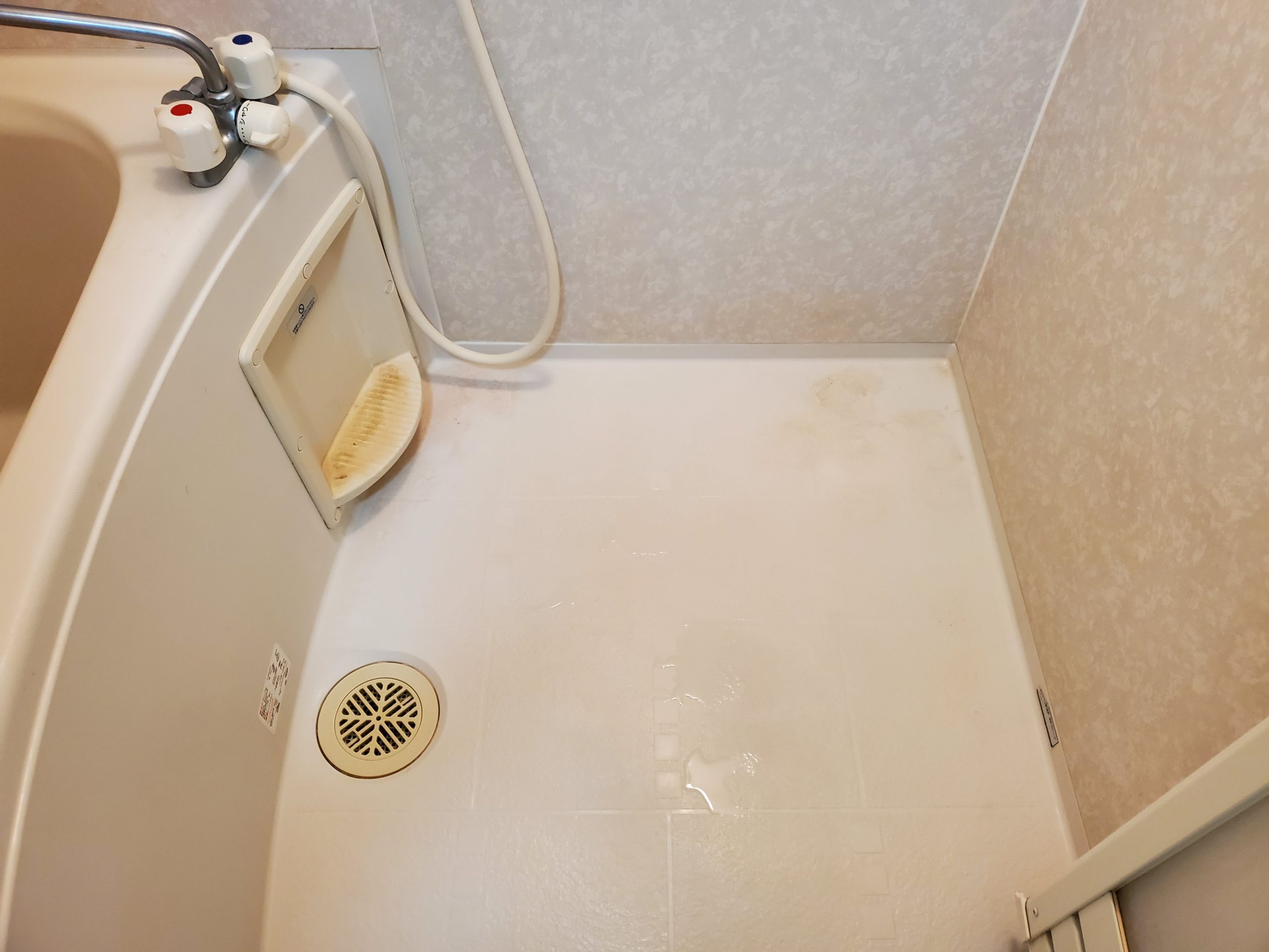 浴槽の底面や洗い場の床には、前入居者様からの蓄積汚れや水垢による「くすみ」が目立っている状態でした。