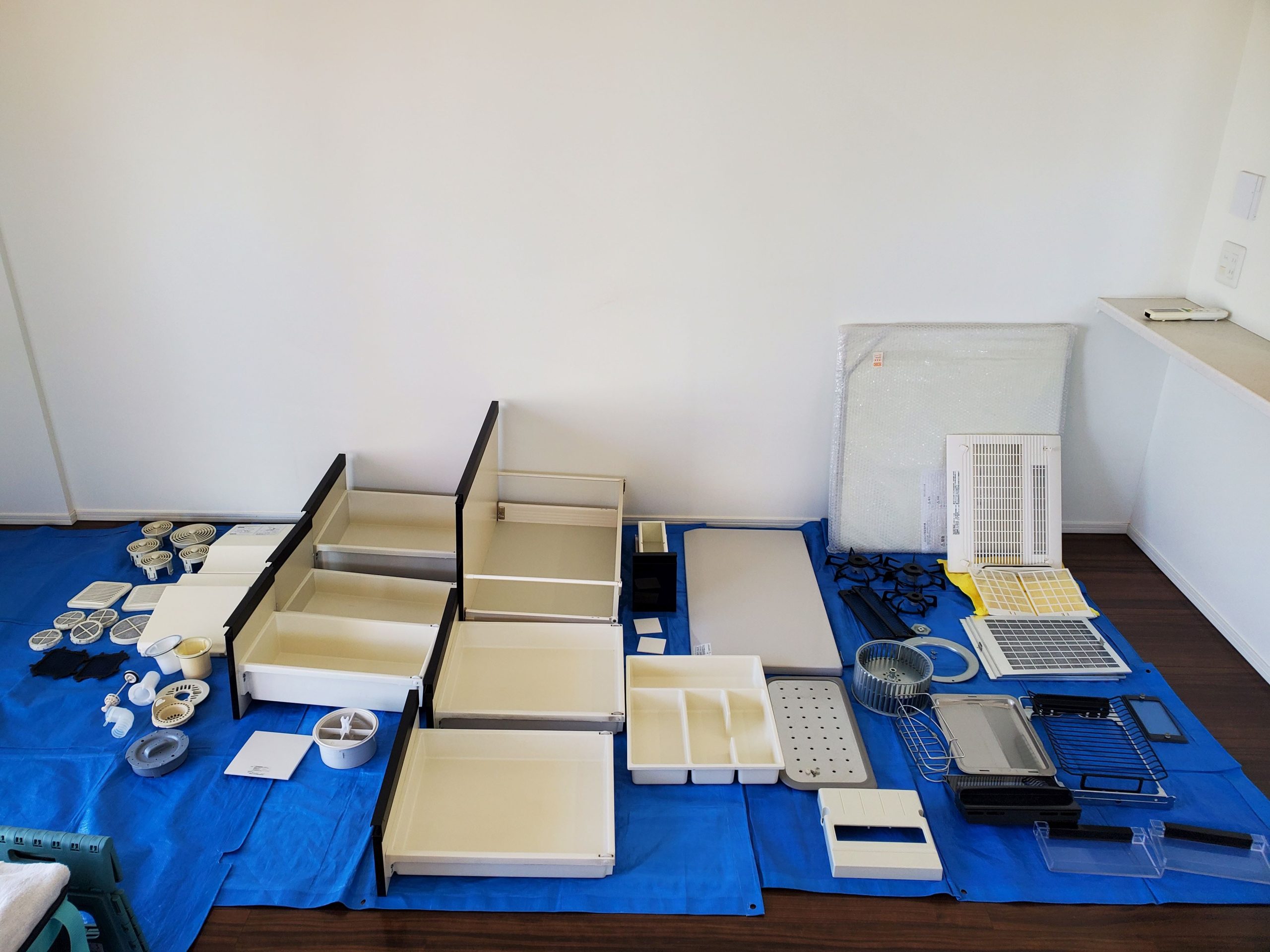 レンジフードや浴室のパーツなど、取り外した各部品はあえて室内に整然と並べています。
