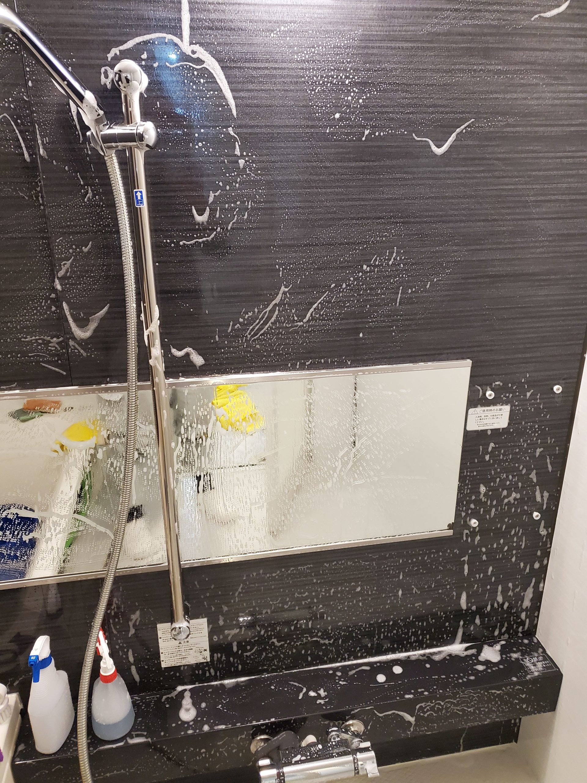 浴室では、壁面や鏡周辺の汚れに対し、適切な薬剤を塗布してじっくりと分解・洗浄いたしました。